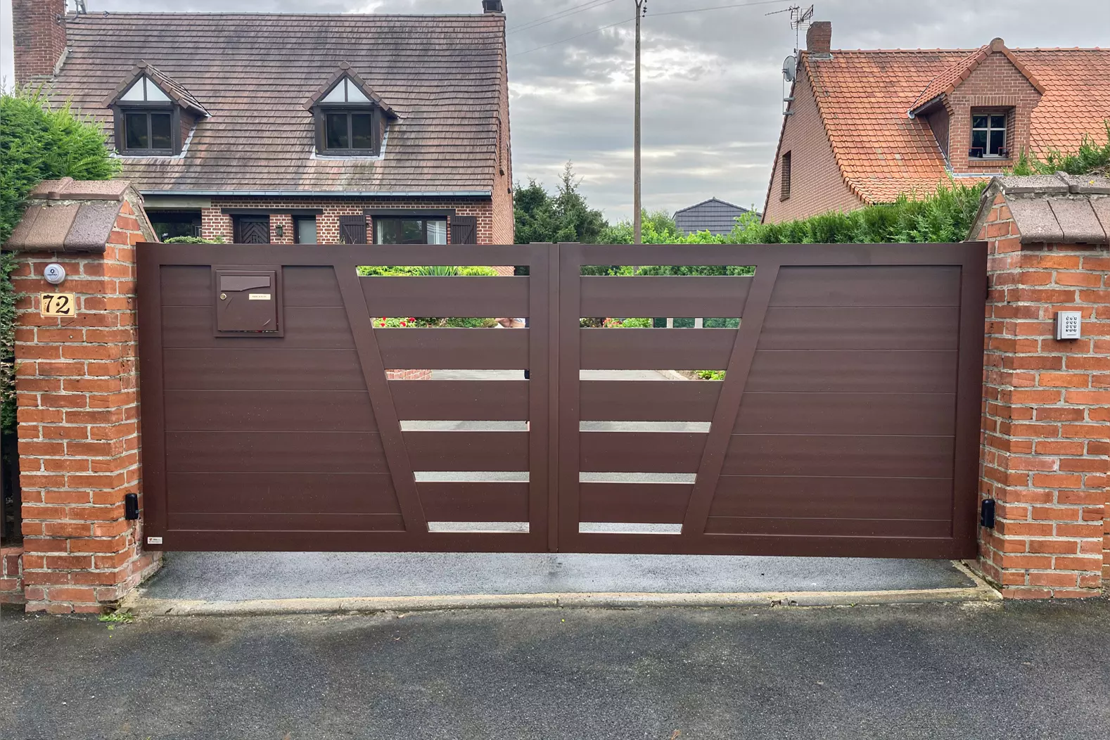 Le portail DIEPPE affirme une identité contemporaine grâce à ses lames horizontales de 200 mm associées à un ajourage central, renforcé par des traverses biais pour un rendu dynamique. Ce jeu de pleins et de vides crée un équilibre parfait entre intimité et ouverture.